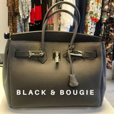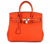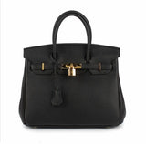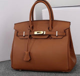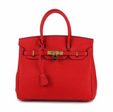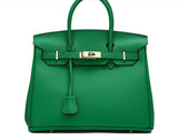 Calfskin leather with gold-tone hardware. Turn-lock closure. One main compartment with leather lining. One interior flat pocket. Top handle with a 3" drop.