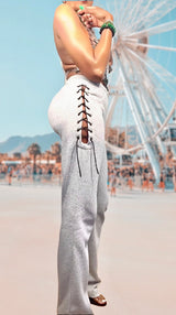 Designed with lace-up the hips detail teasing just enough skin, these sweatpants are serving attitude from every angle. The elastic waistband gives you that perfect, no-compromise fit, while the straight-leg cut keeps it clean, elevated, and unapologetically sleek. Soft, but savage. Cozy, but still a problem. Bling string can be laced upward or downward. Loose Fit. Fabric has a ton of stretch.