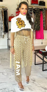 DETAILS: I AM checkerboard joggers. Elastic waistband with drawstring. Side pockets. Elastic hem. Loose fit. Fabric has medium stretch.