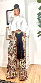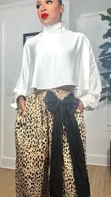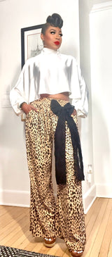 DETAILS: Leopard print wide leg trousers. Loose fit. Large lace bow detail. Side pockets. Elastic waistband. Fabric has some stretch.