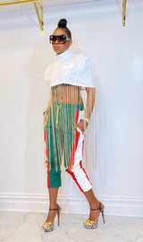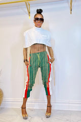 DETAILS: Lux joggers with Tri-color detail. Calf length with inner zipper hem detail. Elastic waistband with drawstring. Side zipper pockets. Regular fit. Fabric has stretch.