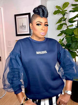 DETAILS: Pullover Sweatshirt with mesh sleeve detail. Round neckline. Drop Shoulders. Ribbing at sleeve and waist hem. Sleeve length above the wrists. **Loose fit/curvy girl friendly.