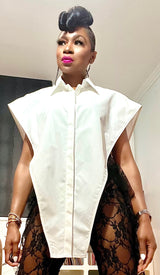 DETAILS: Sleeveless top. Button down closure. Turn down collar. Asymmetrical cut. Loose fit. Sides are completely open.
