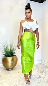 DETAILS: Metallic high waist fitted pencil skirt. Side Zipper closure. Split in the back. Fabric has a ton of stretch.