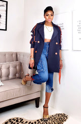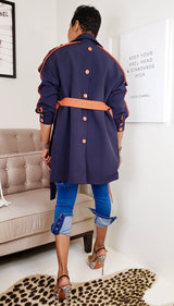 DETAILS: Double Breasted belted trench coat. Turn Down Collar. Orange trimming. Side pockets. Button down back. 3/4 length. Loose fit.